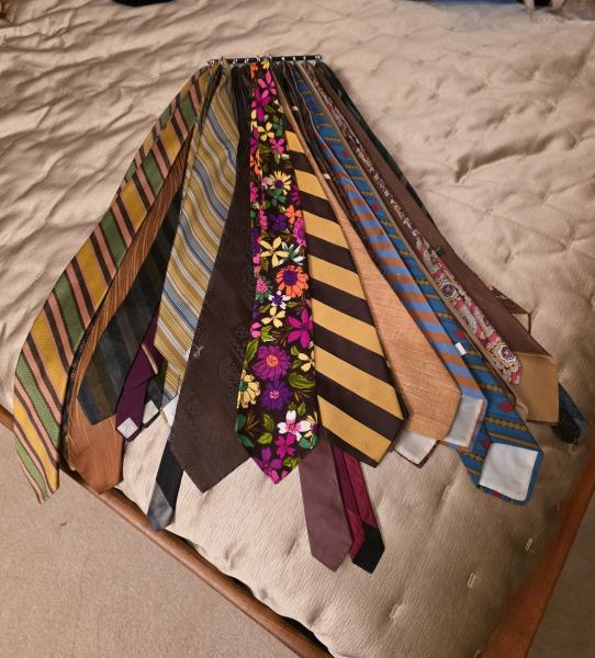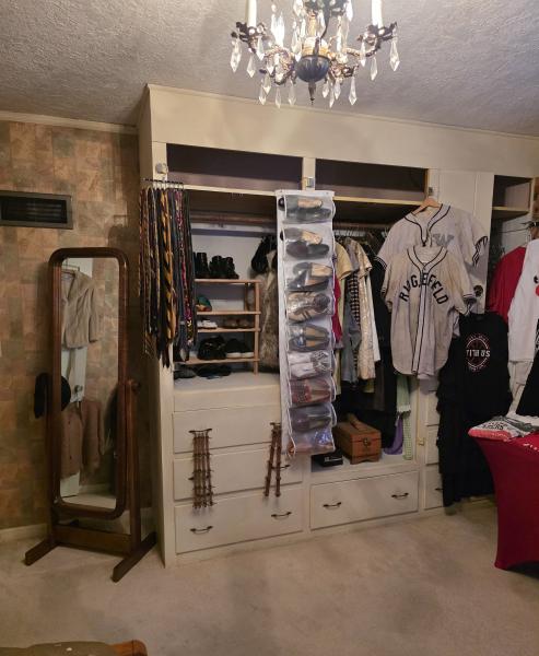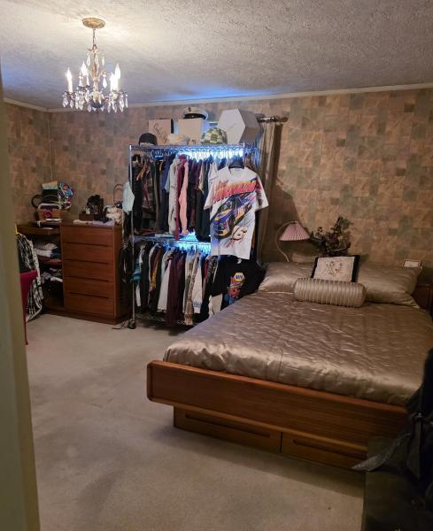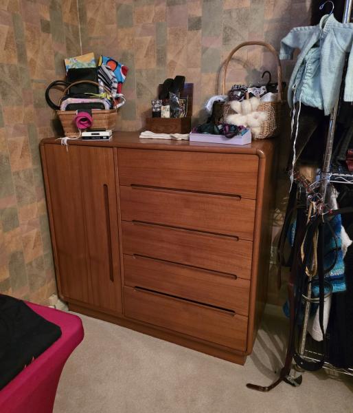 Primary bedroom: Vintage clothing (many pieces hand sewn), designer shoes and purses, Trail Blazer t-shirts and collectables, a mint condition Danish teak wood bed and gentlemen's chest dresser, and more